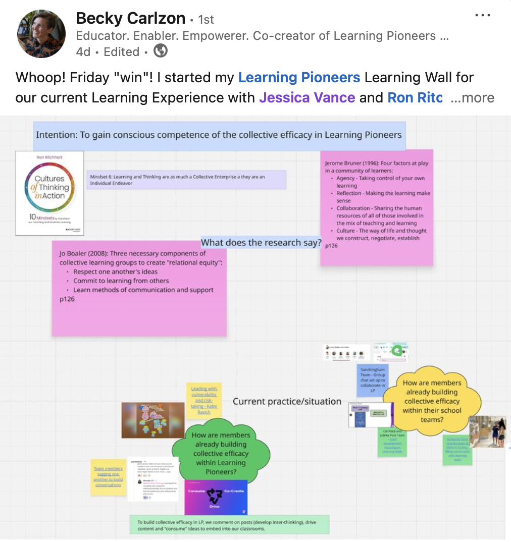 That’s something Becky Carlzon reminded me of during a conversation we had while launching Evidence of Inquiry. Teaching in a virtual setting, Becky builds digital learning walls for the Learning Pioneers community—a space designed to make ongoing inquiry visible and accessible in real time. What stood out wasn’t just the format, but the intentionality behind it. Her walls are not just documenting learning; they authentically and richly support it. Co-created, responsive, and alive with contributions from learners, it served as a powerful reminder: the value of a learning wall isn’t tied to the space it lives in, but to the purpose it serves.